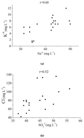 Relationships between Na+ and K+, and SO42− and Cl− (a) Correlation between Na+ and K+. (b) Correlation between SO42− and Cl−.