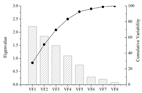 The qualitative information about clustering behaviors was extracted by R-mode factor analysis. The eigenvalues and cumulative variability of all the eight factors are plotted in Figure 9. The first four factors, having a total variance of 83.31% from all the parameters, correspond to four clusters obtained from the cluster analysis.