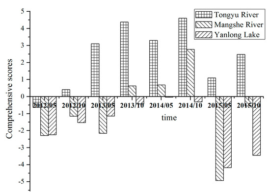 The comprehensive scores of water sources were calculated using Equation (3), and shown in Figure 10. It is evident that the comprehensive scores of the Tongyu River are significantly greater than those of the Mangshe River and Yanlong Lake, which is due to the fact that the hydrogeological conditions in the Tongyu River were quite different from that in the Mangshe River and Yanlong Lake.