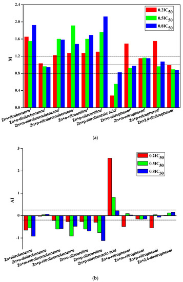 As shown in Figure 1, at the Zn concentration of 0.2 IC50, the binary mixtures of Zn and 7 nitro-substituted benzenes (nitrobenzene, m-nitrobromobenzene, p-nitrobromobenzene, o-nitroaniline, p-nitroaniline, o-nitrophenol, p-nitrophenol) showed antagonism with M ranging from 1.22 to 1.65 and AI ranging from −0.65 to −0.22. The mixtures of Zn and 5 nitro-substituted benzenes (nitrobenzene, m-nitrobromobenzene, p-nitrobromobenzene, o-nitroaniline, p-nitroaniline) all showed antagonism at any Zn concentration (0.2 IC50, 0.5 IC50, or 0.8 IC50). Other binary mixtures are mainly simple addition. The joint toxicity of p-nitrobenzoic acid and Zn (at the concentration of 0.2 IC50 and 0.5 IC50) was exceptions which showed synergism. In general, the joint effects showed mainly antagonism and simple addition when Zn combined with nitro-substituted benzenes. The result is consistent with the research by Cedergreen [42] who found that synergistic interactions between chemicals are rare.