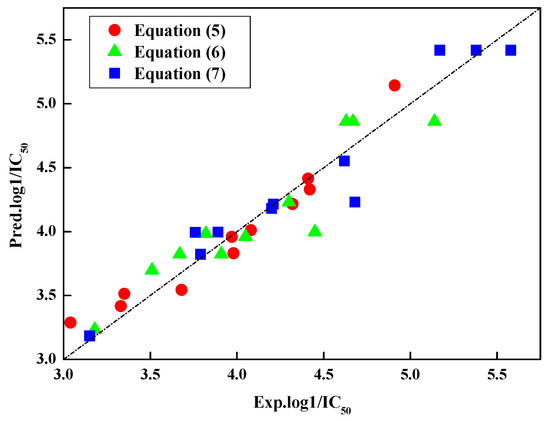 Lower relative errors and good fit of predicted values and experimental values are found by Equations (5)–(7). It demonstrates that QSAR models developed in present paper are robust to predict the joint toxicity of nitro-substituted benzenes when combined with Zn at low, medium, and high concentrations.