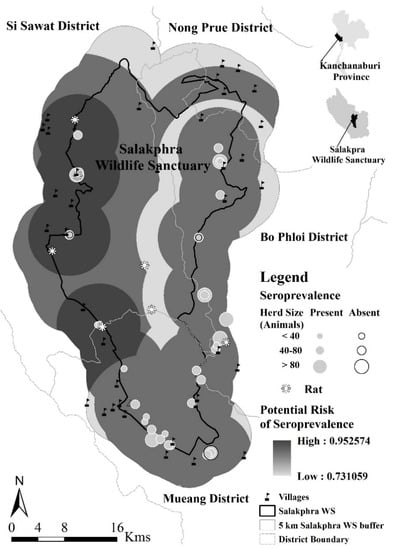 ArcGIS version 10 (ESRI, USA) was used for mapping the relationships between environmental factors and seroprevalence in domestic cattle (Table 3). Information about the raising distances from farms in Salakphra Wildlife Sanctuary, the number of years that the domestic cattle were kept in the farms, the introduction of new animals into the herds, sharing the same routes with other herds, sharing the feeding grounds with other herds, and abortion histories were collected from interviews with the herd owners.