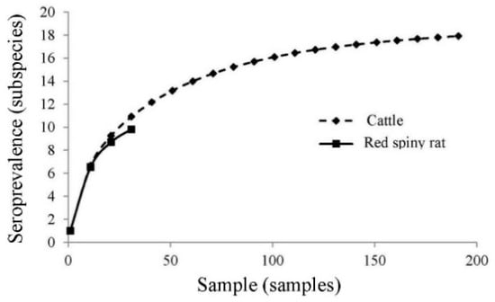 The diversity of seroprevalence in cattle (H′ = 1.027, n = 18 serovars) was higher than red spiny rat (H′ = 0.905, n = 10 serovars) with χ2 = 173.4 (df = 2, p < 0.001). The similarity between cattle and red spiny rat were 62.2% (Table 2), the rarefaction is shown in Figure 2.