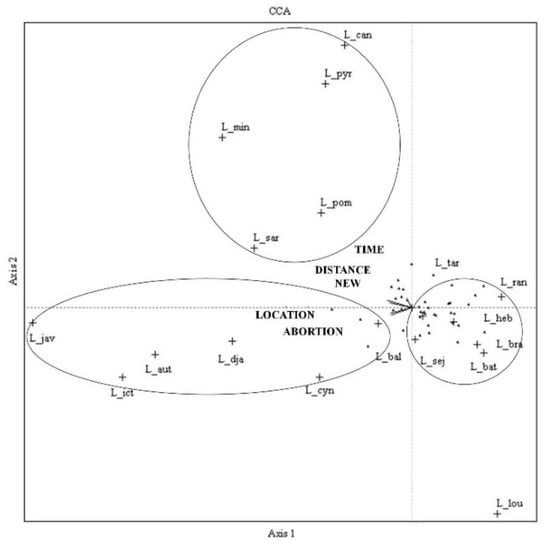 Relationships of 18 seroprevalence and herd variables revealed of domesticated cattle by Correlative Coherence Analysis (CCA) in the Salakphra Wildlife Sanctuary, TIME = Number of years that livestock were kept in the farm (years), DISTANCE = Raising distance (km/day), NEW = Introduced of new animal into herd, LOCATION = Raising in the same route with other herds, ABORTION = Abortion history, L_aut = Autumnalis, L_bal = Ballum, L_bat = Bataviae, L_bra = Bratislava, L_can = Canicola, L_cyn = Cynopteri, L_dja = Djasiman, L_heb = Hebdomadis, L_ict = Icterohaemorrhagica, L_jav = Javanica, L_lou = Louisiana, L_min = Mini, L_pom = Pomona, L_pyr = Pyrogenes, L_ran = Ranarum, L_sar = Sarmin, L_sej = Sejroe.