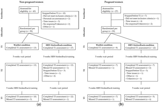 It is possible that the effect of HRV-biofeedback on mental health is different in pregnant versus non-pregnant women. HRV-biofeedback works on the cardiovascular system and pregnancy is characterized by physiological changes such as an increase in blood volume and peripheral vasodilatation []. Also, pregnancy-related higher cortisol levels and a blunted HPA-axis response to glucocorticoids [] may affect the stress response and thereby the stress-reducing effect of HRV-biofeedback. Additionally, autonomic balance is altered during pregnancy, indicated by an increase in sympathetic activity of the autonomic nervous system and a decreased high-frequency HRV []. These differences between pregnant and non-pregnant women in the physiological stress response may also lead to differences in the effect of HRV-biofeedback on stress-related mental health. In order to examine these differences, this study focused on pregnant as well as on non-pregnant women.