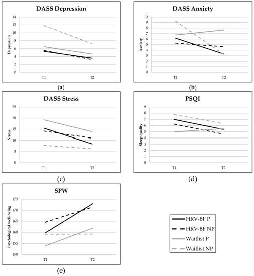 Mean scores on the (a) Depression scale of the Depression Anxiety Stress Scale (DASS); (b) Anxiety scale of the DASS; (c) Stress scale of the DASS; (d) Pittsburgh Sleep Quality Index (PSQI); (e) Scales of Psychological Well-being (SPW) per intervention condition for pregnant and non-pregnant women at pre-test (T1) and post-test (T2). Note: a higher PSQI score represents poorer sleep quality.