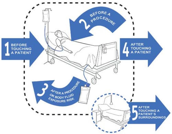 - Hand Hygiene Australia. Five Moments for Hand Hygiene. Available online: https://www.hha.org.au/hand-hygiene/5-moments-for-hand-hygiene (accessed on 22 July 2017).