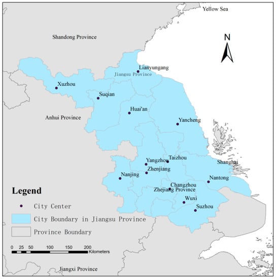 The area of study consists of thirteen prefecture cities, which are Nanjing (the capital city), Wuxi, Changzhou, Suzhou, Zhenjiang, Nantong, Yangzhou, Taizhou, Xuzhou, Lianyungang, Huai’an, Yancheng, and Suqian. The whole province is divided into three parts based on the urbanization level and development period: Southern Jiangsu, including Nanjing, Suzhou, Wuxi, Changzhou, and Zhenjiang; Central Jiangsu, including Yangzhou, Nantong, and Taizhou; and Northern Jiangsu, including Huai’an, Xuzhou, Lianyungang, Yancheng, and Suqian [44]. Jiangsu is of an eastern-Asian monsoon climate. The annual temperature is approximately between 13.6 °C to 16.1 °C with efficient rainfall of nearly 1000 mm annually. Owing to mild climate, Jiangsu is called the land of fish and rice, and is one of the most important grain foundations of China [41].