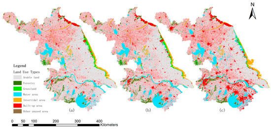 Land use classified map of Jiangsu province from 1990 to 2010: (a) Land use situation in 1990; (b) Land use situation in 2000; (c) Land use situation in 2010.