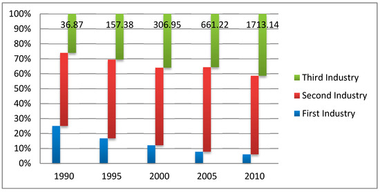 To further study the socio-economic development, the industrial structure also underwent a gradual transformation (Figure 6). We could observe that the industrial structure optimization of the primary industry experienced an accelerating decrease, while the second industry remained slightly stable, and the tertiary industry kept increasing. To be specific, the proportions of the three industries were 25.08%, 48.9%, and 26.03% in 1990; changed to 12.26%, 51.86%, and 35.89% in 2000; and then optimized into 6.13%, 52.51%, and 41.35% in 2010. The tertiary industry was directly reflected by the kinds of service facilities in the research area, which were analyzed in Section 3.4 and showed a clear relation with the LUCC. The industrial structure changed faster than the land use dynamic degree. In Jiangsu province, an agriculture oriented province in eastern China, its industrial structure decides the urban function structure change and the corresponding population transition between the agriculture population and non-agriculture population, which was an important pattern during the rapid urbanization process. As one of the significant driving forces behind LUCC, the planning department should pay attention to the inner optimization of the primary industry, limit the expansion of the second industry, and increase the tertiary industry appropriately.