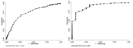 Receiver Operating Characteristic curve for the Quick Mild Cognitive Impairment (Qmci-J) screen to detect those with suspected Mild cognitive impairment (MCI) or dementia (left) and those with suspected dementia (right).