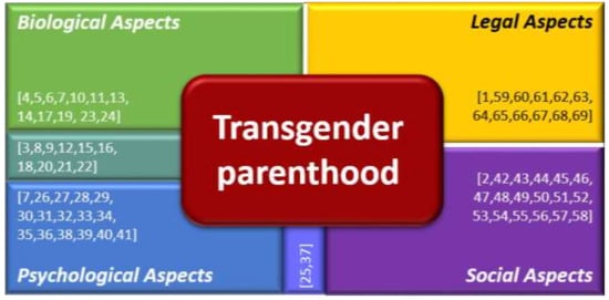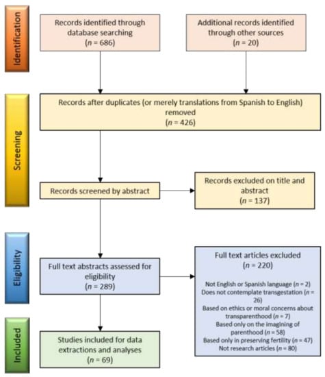 A total of 706 studies with the main objective of transgender parenthood was identified; of these, 69 studies met the inclusion criteria and were used in this literature review. Abstracts were reviewed for relevance, and relevant manuscripts were reviewed in full. Discussion sessions were held to increase the consensus of the group while screening and analyzing. During the consensus meetings, themes were identified through observation and discussion. Refer to Figure 1 to see the flow diagram of the search strategy. In general, the literature search resulted in articles that examined biological (or biomedical) aspects, psychological aspects, social aspects or legal aspects. Particularly this last point, legal aspects, was mainly complex due to the diverse legislations in the different countries. In the most recent years, efforts have been made to more accurately describe the multifaceted interactions between transgender people and biological parenthood. However, authors could not find research that considers holistically all these dimensions.