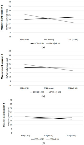 The longitudinal results with mixed models only partially support the prior tested cross-sectional hypotheses. According to the first postulated interaction related to HVA/crea, a significant interaction was only found for LPCBs (see Table 4). The interaction for LPCBs is illustrated in Figure 3a. No significant interactions are found for HPCBs (β = −0.07, t = −1.09, p = 0.14) and dlPCBs (β = −0.09, t = −1.40, p = 0.08), as well as for OH-PCBs (β = −0.06, t = −0.92, p = 0.18). There is only a significant interaction of LPCBs on the association between fT4 and HVA/crea, so hypothesis one can only be partially confirmed.