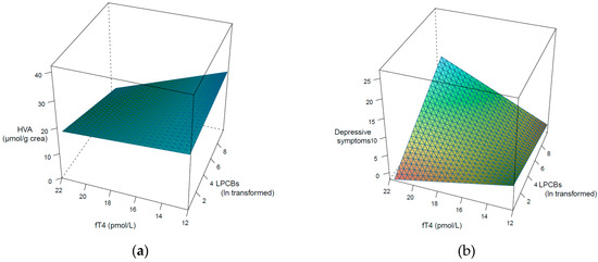 Visualization of the interaction of log transformed and lipid adjusted LPCBs in terms of the association of fT4 with HVA (a) and on fT4 with depressive symptoms (b).