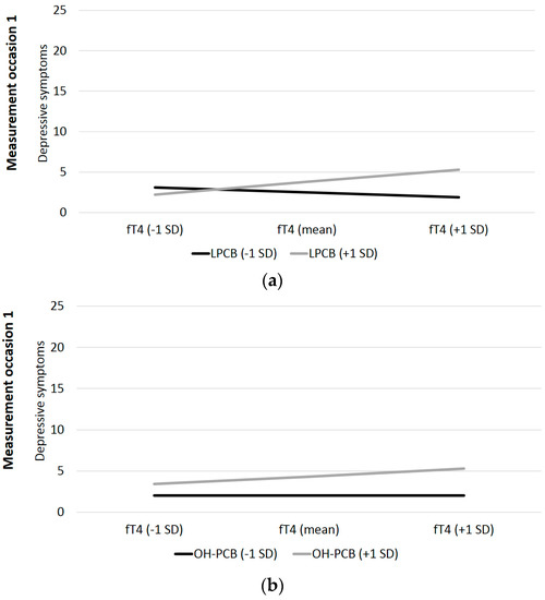 In the mixed effect model analyses, only the interaction effect of LPCBs is significant (see Table 4). The significant interaction effect for LPCBs is visualized in Figure 3b. For HPCBs (β = 0.02, t = 0.39, p = 0.35), dlPCBs (β = 0.07, t = −1.24, p = 0.11), and OH-PCBs (β = 0.07, t = 1.42, p = 0.08), no significant interactions with fT4 on depressive symptoms are found. Thus, hypothesis two can also be partially confirmed for LPCBs under control for the measurement occasions.