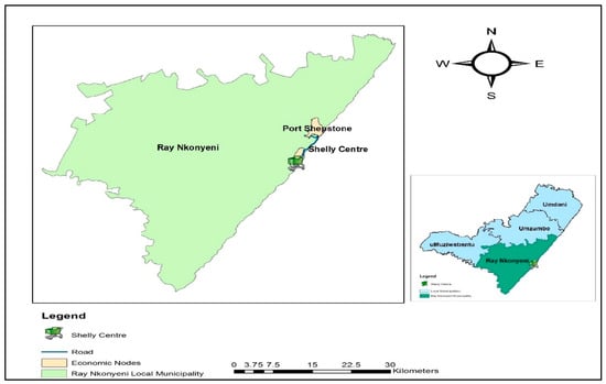The result of the paper is an outcome on research conducted in Shelly Centre in Port Shepstone. The location of Port Shepstone is on the lower south coast of KwaZulu-Natal Province under Ray Nkonyeni Local Municipality, which falls under Ugu District Municipality, in South Africa [27]. The study area was selected using a multistage sampling technique, where out of the nine provinces in South Africa, the selection of Kwa-Zulu Natal Province is random. Out of the ten districts of the Kwa-Zulu Natal Province, Ugu District Municipality is then randomly selected, and the town Port Shepstone and Shelly Centre chosen purposefully. The motivation for the selection of Port Shepstone is because it is the central business area, and Shelly Centre is an upmarket type place in the Ugu District Municipality in the KwaZulu-Natal Province. Consumers of OGPs are usually located within and around the upmarket areas. Figure 1 is a map showing the location of Shelly Centre in Port Shepstone under the Ray Nkonyeni local Municipality.