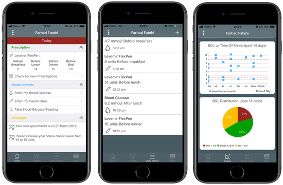 - Ding, H.; Fatehi, F.; Russell, A.W.; Karunanithi, M.; Menon, A.; Bird, D.; Gray, L.C. User Experience of an Innovative Mobile Health Program to Assist in Insulin Dose Adjustment: Outcomes of a Proof-of-Concept Trial. Telemed. E-Health 2017. [Google Scholar] [CrossRef] [PubMed]