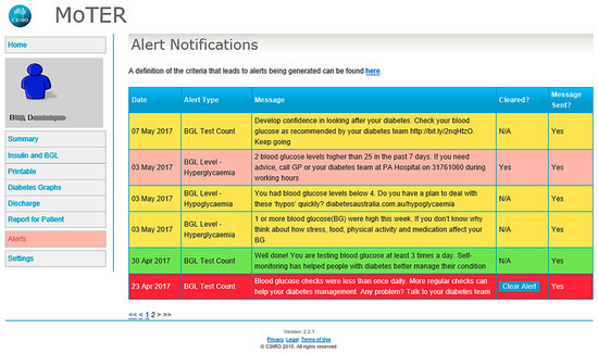 Screenshot of clinician portal showing an example of automated text-messages (accessed by clicking on the alerts tab on the left) sent to the patient based on blood glucose level and testing frequency which are colour coded for easy triaging by the clinician. Clicking on the home tab to the left of the screenshot will display a summary of individual patient details arranged according to the number of red alerts (text-messages).
