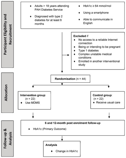Forty-four patients with T2DM attending the PAH outpatient diabetes service will be recruited. The inclusion criteria are (1) T2DM pre-existing for at least 6 months; (2) age > 18 years; (3) HbA1c ≥ 64 mmol/mol (NGSP unit 8%) (performed in the 4 weeks prior to enrolment); (4) using a smartphone daily; and (5) able to read and write in English.