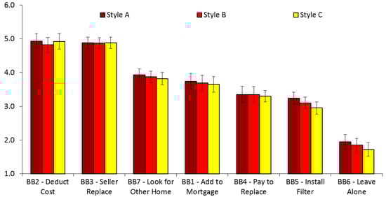 Next, we compared all of the study outcomes by randomized disclosure conditions (“Style A”, “Style B”, and “Style C”) in the seller/buyer study. ANOVAs revealed no statistically significant effects of any randomized experimental conditions on any of the dependent variables in Study 2. Regardless of the style of the disclosure, participants showed clear preferences for being willing to either deduct the cost of replacement from the price of the home, or to insist that the seller replace the LSL as a condition of the sale. These preferences were quite strong, and they corresponded to high values on this scale (closest to 5, anchored with “very likely”—see Figure 3). In contrast, very few respondents reported a willingness to leave the LSL alone, with the other options falling somewhere in the middle.