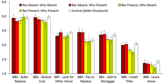 In the seller/buyer and inspector/buyer experiments, BB1 (Buyer-Behavior 1), BB2, BB3, and BB4 (which again describe different strategies for LSL removal) are the most desirable behaviors for reducing lead exposure in the home, in perpetuity. The “Recommendations present” conditions in the home inspector disclosure study made explicit recommendations for BB1, BB2, or BB3. BB5 (lead water filter), and BB7 (look elsewhere) are less desirable for the same reasons described above. BB6 (leave it alone) is undesirable, since it leaves the exposure unchanged, and it does not incentivize the seller to replace the LSL.