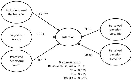 Attitude toward the behavior was found to positively affect the intention of illegal waste disposal (β = 0.25, p < 0.01), thus supporting H1. In addition, perceived behavioral control had a significant positive effect on the intention (β = 0.19, p < 0.05), thereby supporting H3. The findings thus indicated that subjective norms, perceived certainty of sanctions, and perceived severity of sanctions did not have any significant effects on the intention, meaning that H2, H4, and H5 were not supported.
