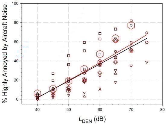 Exposure–response curves for aircraft noise annoyance responses in the WHO dataset []. “Highly annoyed” refers to respondents using ≥73% of the annoyance response scale. The red data points and regression line refer to study size weighting according to sample size; the black data points and curve refer to the same dataset without study size weighting.