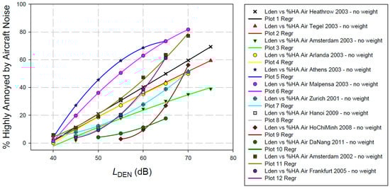 Individual exposure–response curves for aircraft noise annoyance responses in the 12 studies of the full WHO dataset []. % Highly Annoyed (%HA) refers to respondents using ≥73% of the annoyance response scale (same definition as in Figure 1). No weighting according to sample size is applied here.