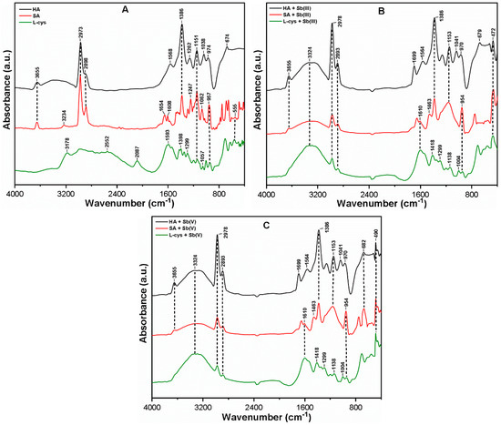 FT-IR analyses of (A) pristine HA, SA, and L-cys; (B) Sb(III)-NOM; and (C) Sb(V)-NOM complexes.