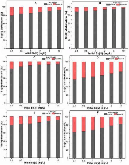 In order to further explore the complexation of Sb with each NOM, free and bound Sb were analyzed, and the results are presented in Figure 2A–F. It can be seen that a considerable portion of Sb was complexed with different NOM with higher Sb(V) binding affinity as compared to Sb(III). As shown in Figure 2A,D, the portions of Sb(III) and Sb(V) bound to HA were 7.11–20.4% and 23.48–42.51%, respectively. Meanwhile, the complexation abilities of Sb(III) and Sb(V) species with SA, L-cys were found to be 2.11–10.63%, 5.86–17.31% and 8.43–20.62%, 17.24–36.96%, respectively (Figure 2B,C,E,F). Moreover, Figure 2A–F also illustrate that the proportion of Sb bound with each NOM decreased with increasing initial Sb(III, V) concentration.
