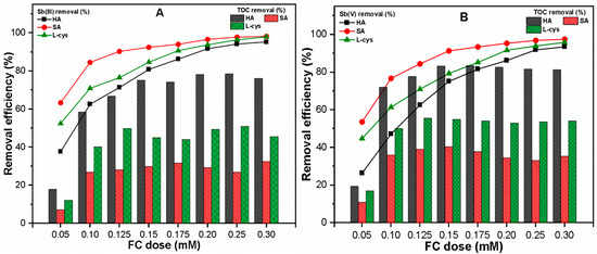 The TOC removal was also monitored for both the Sb(III) and Sb(V) systems, as shown in Figure 3. The results suggest that a relatively higher TOC removal efficiency was observed in the Sb(V) system than the Sb(III) system. This may be attributable to the fact that Sb(V) species bound to NOM more strongly than Sb(III) species (Figure 2A–F). Moreover, at OD, the HA showed much higher TOC removal (84.91 and 88.66%) in the Sb(III) and Sb(V) systems, respectively. The higher anionic binding sites in HA might form insoluble complexes with cationic Fe precipitates at an appropriate FC dose as a result of charge neutralization [26,50]. Such phenomena may be responsible for the efficient TOC removal from water, irrespective of Sb species. As compared with hydrophobic ligands, the hydrophilic NOM such as L-cys, SA presented less TOC removal, specifically, 47.80, 30.60% and 57.55, 43.83% in the Sb(III) and Sb(V) systems, respectively (Figure 3A,B). The low TOC removal in SA may be related to the presence of weaker acidic groups and LMW compounds, which hinder the interaction with Fe precipitates [51]. Besides its hydrophilic characteristics, the complexations of positive charge Fe precipitates with a negatively charged S–H group in L-cys might have contributed to its relatively better TOC removal than SA [18]. Our results are consistent with those of previous studies [52,53], which showed higher removal of hydrophobic NOM than hydrophilic during the coagulation process. Our findings revealed that the NOM type is likely to influence the required coagulant dose, and thereby the Sb(III, V) and TOC removal from water during the C–F process.
