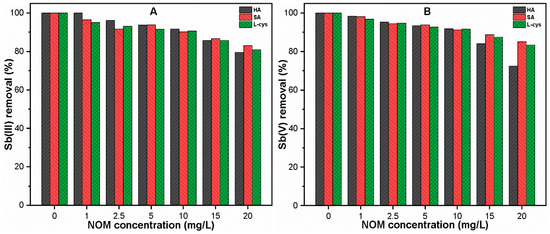 Under optimum FC doses, (A) Sb(III); and (B) Sb(V) removal at various NOM concentrations (0–20 mg/L) is shown.