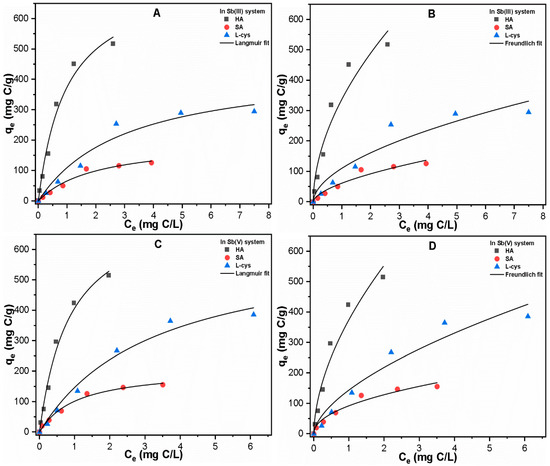 In order to further confirm the adsorption phenomena of each NOM onto precipitated Fe, an adsorption isotherm study was conducted at varying NOM concentrations (0–20 mg/L) in the Sb(III, V) system (Figure 5A–D). As shown in Table 1, the maximum adsorption capacity of HA onto Fe precipitates was found to be much higher, at 742.49 and 759.73 mg C/L in Sb(III) and Sb(V) systems, respectively, as compared to those of SA (198.74 and 208.76 mg C/L) and L-cys (446.75 and 627.51 mg C/L). These results suggest the higher adsorption potential of hydrophobic ligands toward Fe precipitates as compared to hydrophilic ligands. Our results are consistent with those of a previous study [54] showing the stronger adsorption capacity of HA on Fe3O4 surface. In addition, the correlation coefficient (R²) indicated better Langmuir fitting of all NOM on Fe precipitates in both systems, thus suggesting that there is monolayer adsorption onto Fe precipitates. In general, these results suggest that the characteristics of NOM should be considered for the treatment of heavy metal-polluted water.