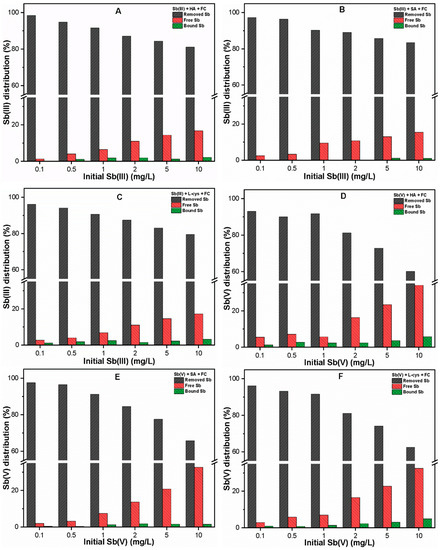 Percentage distributions of (A–C) Sb(III) and (D–F) Sb(V) in NOM (10 mg/L) solutions after FC coagulation.
