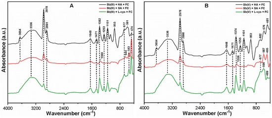 Figure 7 shows the FT-IR spectra of FC composite flocs after interacting with Sb(III, V) and NOM (HA, SA, and L-cys). The broad peak at ~3336 cm−1 present in all flocs corresponds to the stretching vibrations of Fe hydrolyzed products, which form complexes with NOM molecules and Sb species [19,57]. The disappearance of the S–H group at ~2548 cm−1 in both Sb(III, V) systems was subjected to covalent bonds between thiols and Sb species onto Fe surface [38]. The peaks appearing at ~1648, and ~1471 cm−1 were attributed to the C=O stretching of amide groups and CH2 stretching vibrations, respectively [32]. This confirms the adsorbed Sb-NOM complexes onto Fe precipitates with intensities in the order HA > L-cys > SA. The shift in the band to ~1253 cm−1 in the presence of HA and L-cys suggests the involvement of carboxylic, phenolic, and thiol groups in complexation with Sb(III, V) via ligand exchange [17]. As shown in Figure 7A, the oxidation of Sb(III) to Sb(V) was confirmed in the presence of HA and L-cys as indicated by the peak at ~677 cm−1, which is near ~682 cm−1 and assigned to Sb(V)–O stretching vibrations [29]. It should also be noted that the HA molecules contain strong oxidation potential for Sb(III) species, as confirmed from the peak appearing at ~591 cm−1 (corresponding to Sb(V) species), while a small peak was observed at ~474 cm−1 that was ascribed to Sb(III)-O stretching vibrations [29]. On the other hand, two broad peaks at ~474 and ~543 cm−1 were observed in the cases of SA and L-cys, respectively, which correspond to Sb(III)-O stretching vibrations. Consistent with our observation, a previous study [17] also found evidence of Sb(III) oxidation in the presence of HA molecules.