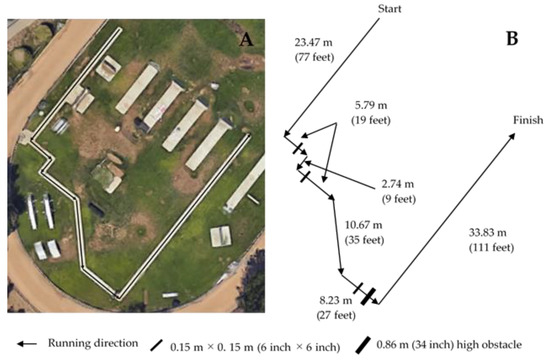 The 99-yard obstacle course. (A) Aerial map of the course. (B) Dimensions and running direction.