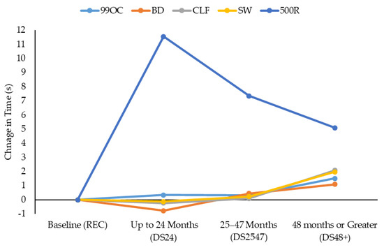 Figure 2 displays the difference in the mean times for the WSTB tasks through the time points established with the deputy sheriff groups (REC: baseline; DS24: up to 24 months working in custody; DS2547: 25–47 months working in custody; DS48+: 48 months or greater working in custody). For the 99OC, BD, CLF, and SW, there was a notable change in task performance past 48 months of custody work (which, as stated, was significantly different from the baseline for the 99OC, CLF, and SW; Table 1). For the 500R, the most pronounced change in performance time came after 24 months, before this was reduced in subsequent time points. Nonetheless, all of these were significantly different from the baseline established by the REC (Table 1).