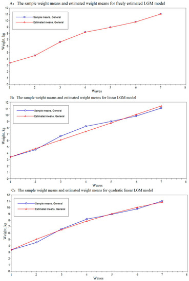 The weight means and estimated weight means of the children in unconditional freely estimated, linear, quadratic latent growth curve models. The child weight appears on the vertical axis (y) and the horizontal axis (x) represents the seven-time points; the axes should be continuous, not broken. The blue line represents the sample means and the red line represents the estimated means of the LGCMs. Panel (A) displays weight means and estimated weight means of the children in the unconditional freely estimated LGCM. Panel (B) displays weight means and estimated weight means of the children in the unconditional linear LGCM. Panel (C) displays weight means and estimated weight means of the children in the unconditional quadratic LGCM.