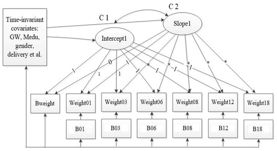 LGCMs were used to investigate the association of trajectories of child weight aged 0–18 months. The trajectories of weight change were modeled with two latent variables: Latent intercept growth factor, representing the initial status of the child weight; and latent slope growth factor, reflecting the rate of the weight change. The loadings from the intercept factor to each of the repeated measures were set to the fixed values of 1.0 and the slope factor loadings allowed flexibility settings. In this study, we modeled the trajectory of children’s weight based on three assumptions to identify the most suitable model. First, for a linear change assumption of child weight, the slope factor loading was set at 1, 2, 3, to 6 for 1-month-old, 3-month-old, 6-month-old, to 18-month-old respectively. Second, with quadratic change assumption, an additional quadratic slope factor with appropriate factor loadings needed to be added to represent the quadratic term. For example, the quadratic slope factor loading was set at 1 for the first follow-up, 4 for the second follow-up, and so on. Thirdly, a more flexible change assumption was modeled by setting some of the factors free for the subsequent follow-up measures.
