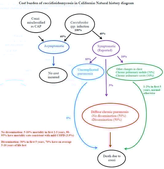 This cost-of-illness study used a “bottom-up” approach to estimate the lifetime costs of all 2017 reported incident cases in California. We firstly modeled the natural history of the disease, and then calculated lifetime costs by identifying specific items of healthcare use. The frequency of healthcare use was then multiplied by the proportion of cases utilizing the item of healthcare, and the costs of each item. We used a societal approach and determined both direct and indirect costs in 2017 US dollars and discounted lifetime indirect costs to present value. Our data were obtained from literature, national datasets, and expert interviews (Drs. Harold Lin, Michael MacLean, Michael Peterson, Nathan Stockamp, Robert Libke, personal communication, January–August 2014), and was exempted by the University of California, San Francisco (UCSF) Institutional Review Board. Expert interviews were used to better understand the natural progression of valley fever and helped guide treatment algorithms. A literature-based initial lifetime treatment model was modified by each expert based on their clinical experience (see Figure S1, Supplementary Materials). Experts each estimated population probabilities at each point in the model based on their extensive experience and knowledge treating coccidioidomycosis infections, especially in endemic areas of California. Any differences among experts were then discussed, and a consensus was reached on the best estimates before national costs were applied. These methods are used frequently, in cases such as these, to supplement estimates where literature and databases lack the necessary detailed information [9].