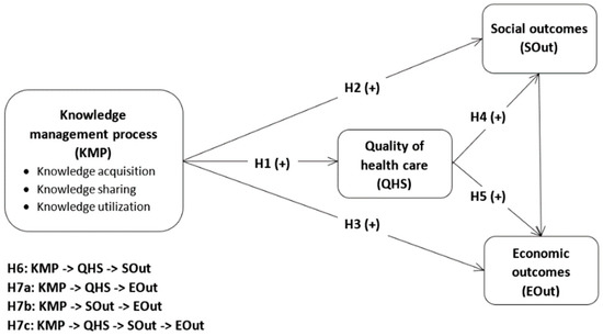 Given the above theoretical approach, past research, and our own experience, a conceptual model is proposed, categorizing three KM processes (knowledge acquisition, knowledge sharing, and knowledge utilization), quality of healthcare, social outcomes, and economic outcomes. Seven latent constructs, their hypothesized relationships, and subsequent rationales are illustrated in the conceptual model presented in Figure 1.
