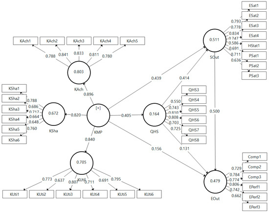 Measurement model computed with SmartPLS 3.2.7 (GmbH, Bönningstedt, Germany) [72]. Note: KAch—knowledge acquisition; KSha—knowledge sharing; KUtil—knowledge utilization; KMP—knowledge management process; QHS—Quality of health services; SOut—social-related outcomes; EOut—economic-related outcomes.