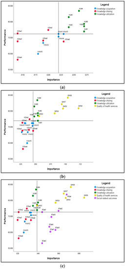 Importance-Performance Matrix Analysis (IPMA) for the target constructs: (a) quality of healthcare, (b) social outcomes, and (c) economic outcomes. Source: authors computation with SmartPls 3.2.7 (GmbH, Bönningstedt, Germany) [72] and IBM SPSS 25.0 (IBM Corp., Armonk, NY, USA) [55].