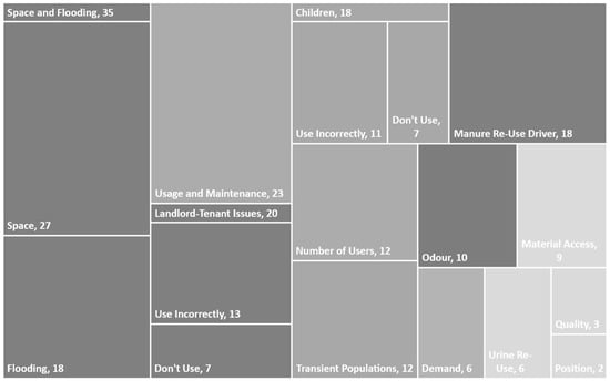 Beyond the general constraints to the whole sanitation sector that inhibit the development of reuse in agriculture, there are many issues specific to the use of the Skyloo latrine design. Figure 1 shows the themes mentioned by Skyloo users in our study, with the area of the boxes corresponding to the number of interviewees who mentioned the issue. There were many issues of poor maintenance found with farmers (23 mentions), which often related to either a lack of defined responsibilities between landlords and tenants (20), too many users (12), a high turnover of tenants leading to people who were not used to the technology (12) or children struggling to adjust to the technology (18). Skyloos were adopted to deal with the issues of space and flooding in pit latrines (35), and sometimes due to the high construction quality (2). It was noted that some households were specifically attracted to the ability to produce compost (18), though complaints existed around finding a market demand for compost (6), how to manage diverted urine in Skyloos that used urine diversion (6), bad smells (10) and getting materials to maintain the Skyloo (9). Other issues noted related to the positioning of the latrine causing issues in management (2).