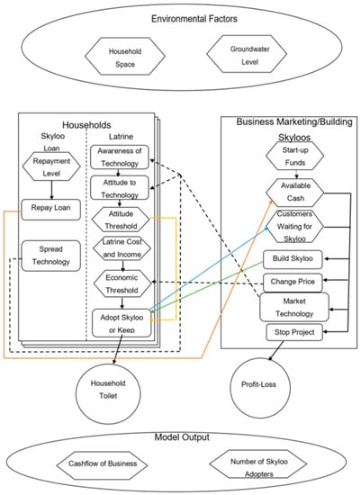 The Skyloo ABM model structure is shown in Figure 2; this is broadly similar to the approach of Panebianco and Pahl-Wostl []. The agents are the householders who decide whether or not to adopt Skyloos, and the business which markets and builds the technology. Households that decide to have a Skyloo installed take a loan for the cost of construction, and repay it at a fixed rate.