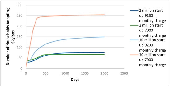 Figure 3 shows the number of households adopting Skyloos for the different financial scenarios. Unsurprisingly, the greater start-up finance and cheaper payback situation gave rise to an earlier and greater adoption of the technology. It is important to note that these results say nothing directly concerning either FS reuse or environmental quality, though adoption of Skyloos might reasonably be regarded as a proxy for these, if managed correctly. Most adoptions occur earlier in the cycle; however, for both high start-up finance scenarios, there is evidence that adoptions are continuing to grow slowly even at the end of the model run, five and a half years after the inception of the business. This continuing growth is less obvious for the lower start-up capital scenarios.