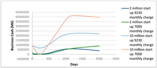 Figure 4 shows the business cash flow of Skyloo implementation in different finance and price scenarios. The level of finance is vital to cash flow and adoption levels, as in the MK10,000,000 start-up fund a business can satisfy more demand before customers ‘unadopt’ technology. The higher start-up finance situations experience an early ‘dip’ but end up with robust cash reserves to the business, although this is declining at the end of the model run and may be unsustainable in the very long term. The very lowest finance option with the lower loan repayment scheme is the only situation where the business cash is still growing at the end of the 2000 day period.