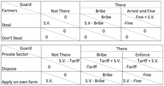 The interactions of the various stakeholders were modelled using a Game Theory approach to examine how the agents adjust their behaviour based on the relative pay-offs of different approaches [,]. In our model, for example, private companies have an initial probability of either illegally applying sludge on their own land or disposing at the municipal FS site, while the site guard has the choice of accepting bribes or enforcing the law. Based on the effective pay-off of each interaction, agents then adjust the probability of their behaviour to increase their chances of increasing their payoff in future interactions. There are two components to the pay-offs of different behaviours for each agent: the intrinsic value of the FS in their possession, and the loss/gain of money from paying dumping fees, bribes or fines. The pay-offs and risks of different interactions are shown in Figure 5.