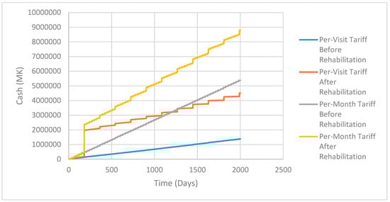 Figure 6 shows the cash flow of different treatment approaches for the city council. A monthly permit approach is more effective at collecting revenue for the municipality, which could theoretically be used for increased enforcement or investment in infrastructure. There are increased revenues from selling compost every six months, the initial increase in cash after the first six months being notable on the figure. Compost sales income is enhanced after rehabilitation, where it is assumed the guard is present all the time, preventing theft of FS. Thus, the ABM has shown that the rehabilitated site with a monthly permit system for disposal companies provides the best option of those tested in terms of municipal revenue.