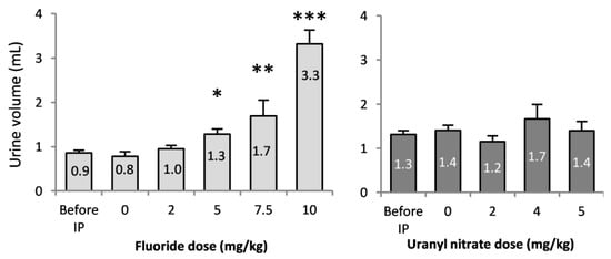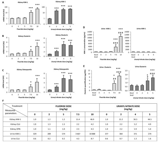 3.1. Dose-Dependent Increase of F and U in Urine